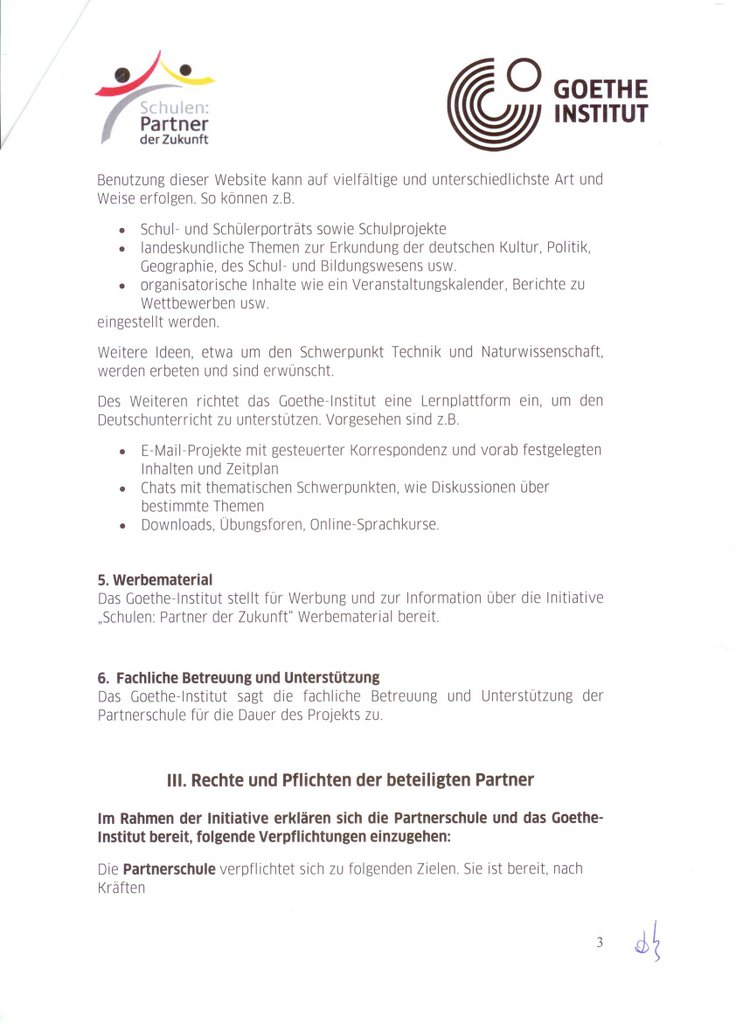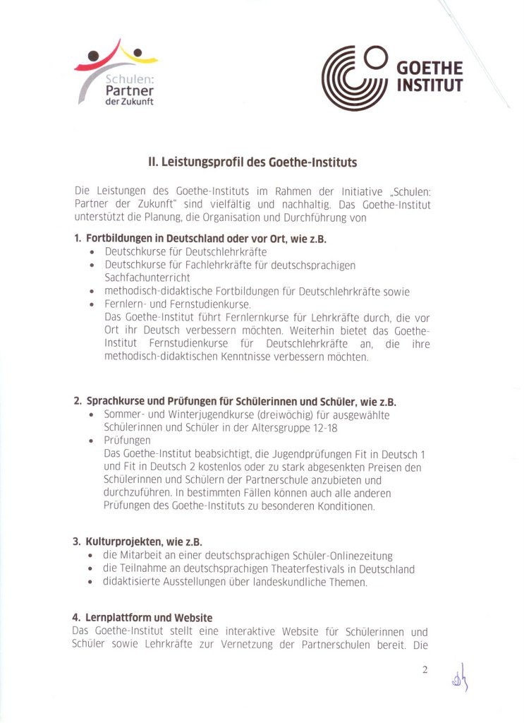 Instytut Goethego profesjonalnie wspiera szkoły oferując min. szkolenia w zakresie metodyki i dydaktyki dla nauczycieli, dziesięciodniowe obozy językowe i trzytygodniowe kursy wakacyjne dla najlepszych uczniów. Udostępnia interaktywną stronę internetową w celu powiązania wszystkich szkół partnerskich. Umożliwia udział uczniów w projektach kulturalnych, tj.np. niemieckojęzyczne festiwale teatralne w Niemczech, niemieckojęzyczna gazetka internetowa we współpracy z innymi szkołami partnerskimi z całej Europy.