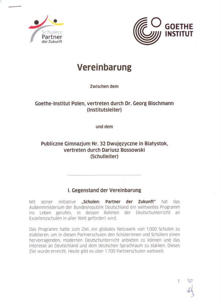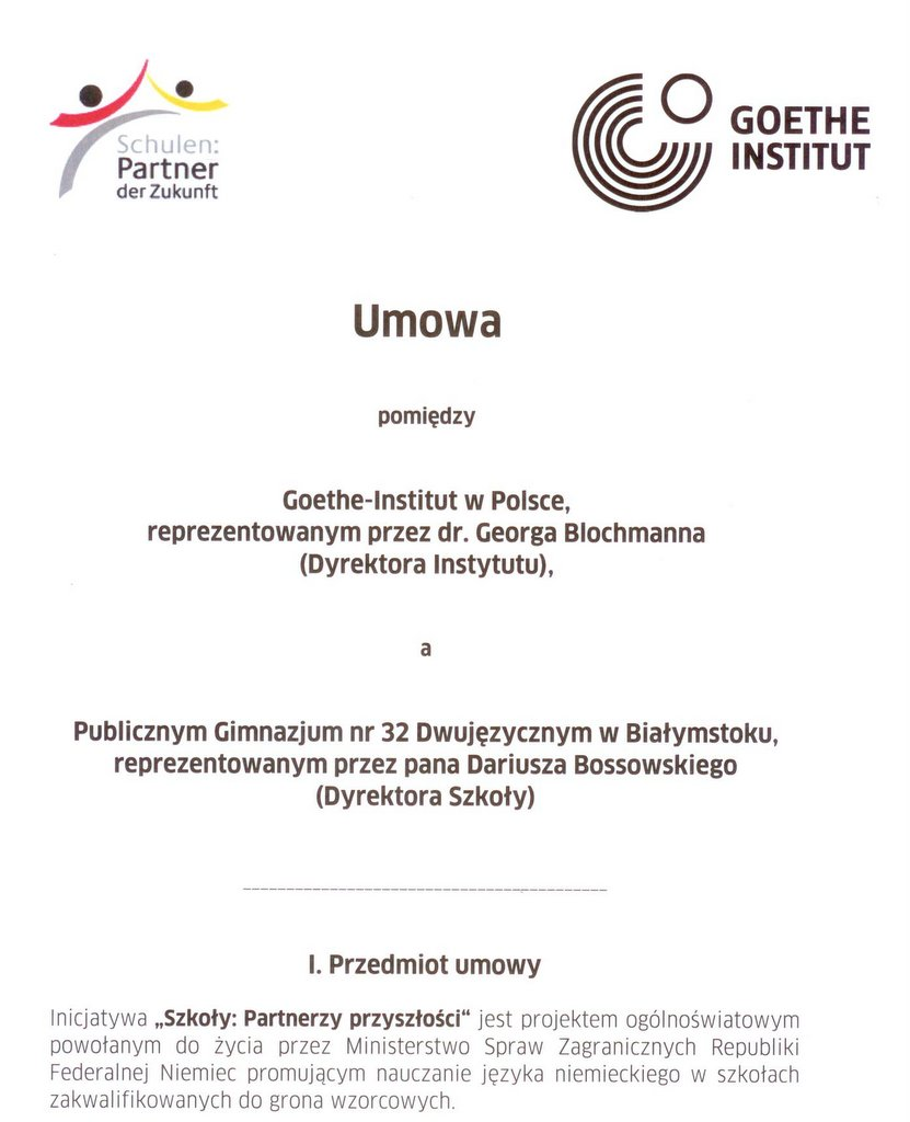 Dnia 30 maja 2014 r. Pan Dariusz Bossowski Dyrektor Publicznego Gimnazjum nr 32 Dwujęzycznego w Białymstoku podpisał porozumienie o współpracy z Panem Doktorem Georgiem Blochmannem Dyrektorem Instytutu Goethego w Warszawie. Tym samym Publiczne Gimnazjum nr 32 Dwujęzyczne (dziś: Szkoła Podstawowa Nr 53 z Oddziałami Dwujęzycznymi) znalazło się w gronie 9 elitarnych szkół w Polsce, z którymi Instytut Goethego podpisał umowę o współpracy w ramach inicjatywy "Szkoły: Partnerzy Przyszłości" ("Schulen-Partner der Zukunft").