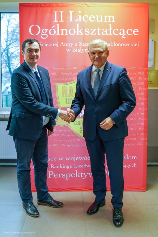 10 stycznia 2020 r. naszą szkołę odwiedził Prezydent Miasta Białegostoku Pan Tadeusz Truskolaski i złożył gratulacje z okazji uplasowania się II Liceum Ogólnokształcącego im. księżnej Anny z Sapiehów Jabłonowskiej na pierwszym miejscu w województwie podlaskim w rankingu szkół PERSPEKTYWY 2020. Prezydent podziękował za zaangażowanie i trud włożony we wzorową organizację procesu kształcenia oraz stwarzanie młodzieży możliwości uzyskiwania wybitnych osiągnięć. Miłym akcentem spotkania z Radą Pedagogiczną były szkolne wspomnienia, ponieważ Prezydent Miasta Białegostoku Pan Tadeusz Truskolaski jest absolwentem II LO.